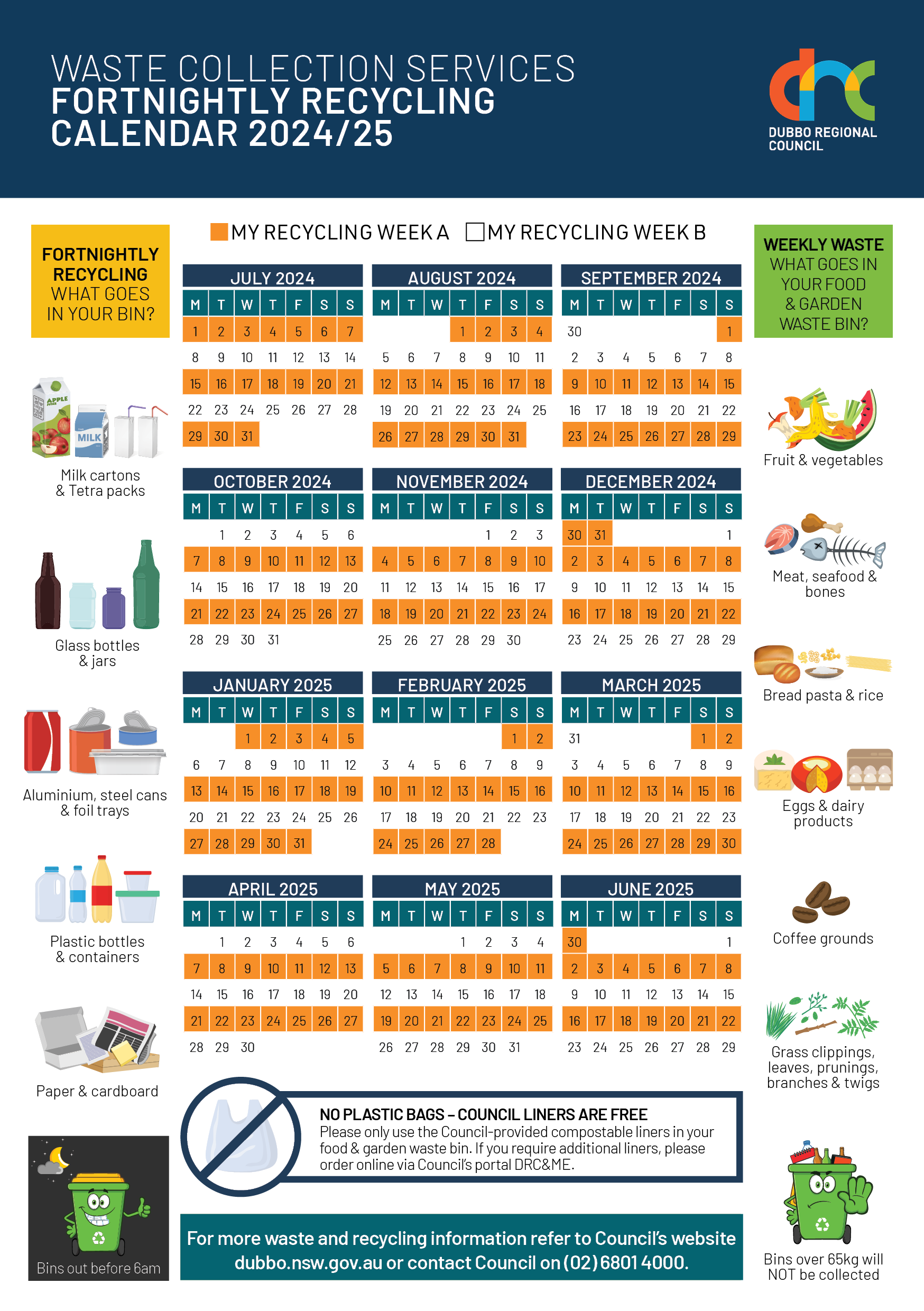 The Dubbo Regional Council collects rubbish weekly early on Friday mornings, red bins weekly and yellow bins two weekly. The website should give our recycling week but doesn't appear to have heard of either Alexandrina Avenue or Fountain Circuit - but we are recycling week A..